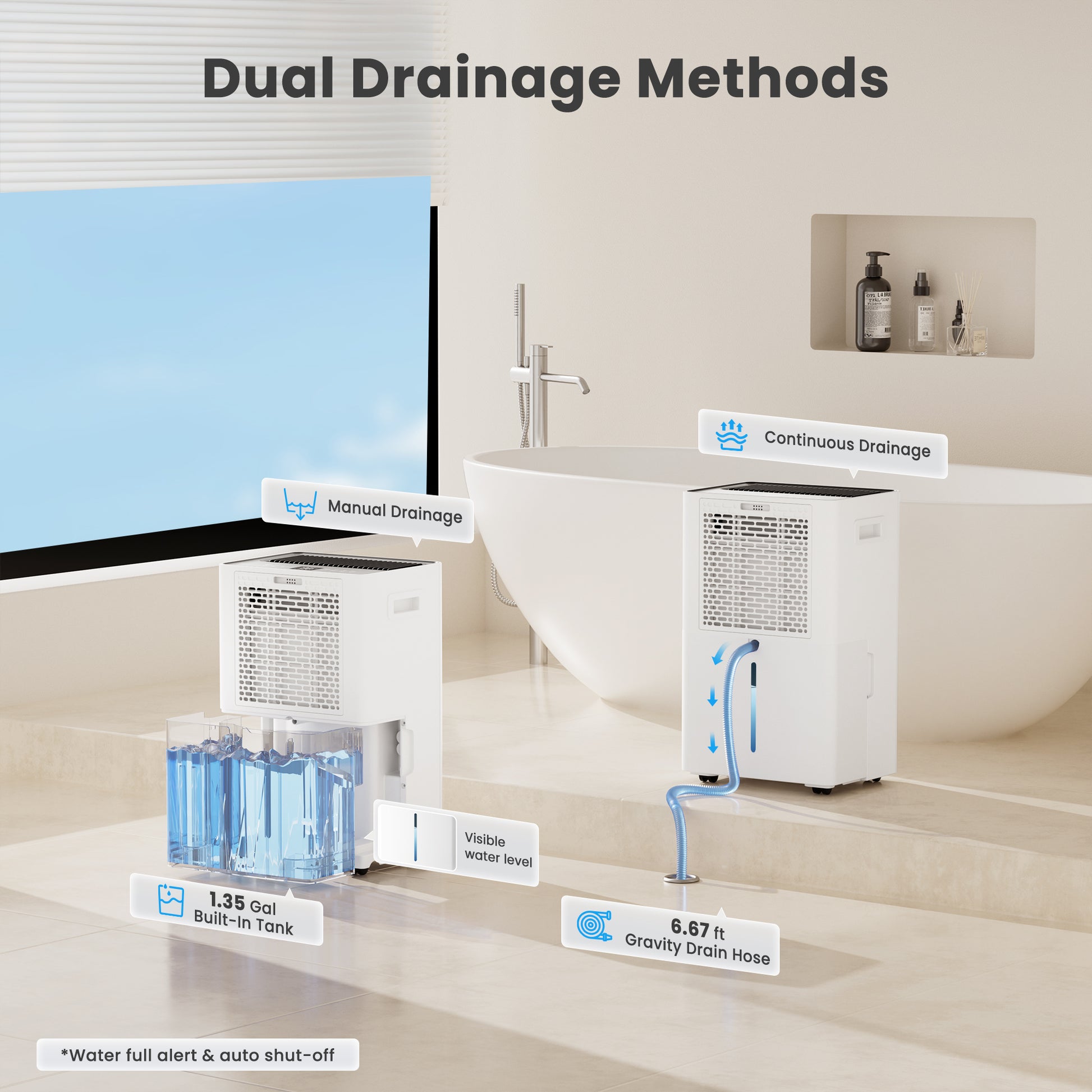 - Dual Drainage Freedom – The portable dehumidifier designed with dual drainage methods. Choose the convenient 1.35 gallon tank with auto-shutoff(no overflow worries) for manual drainage, or opt for continuous hands-free operation using the included 6.67 ft hose (connects to floor drains/pumps). Perfect for Daily use (easy tank removal),Long-term basement/crawlspace projects (set-and-forget hose mode),Vacation homes (avoid frequent maintenance)