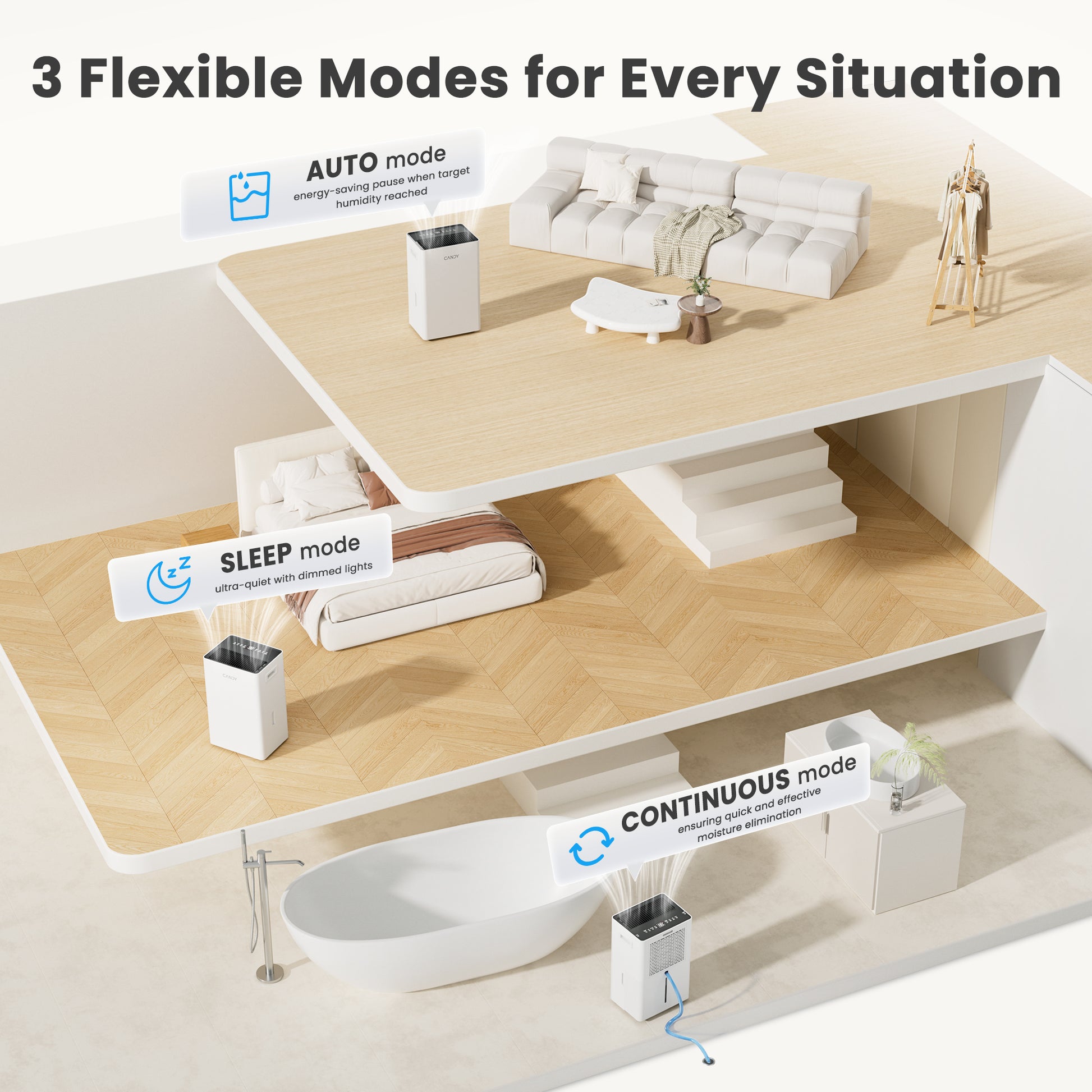 - Customizable Comfort with 3 Modes – Candy's room Dehumidifier features three specialized modes:CONTINUOUS mode (ensuring quick and effective moisture elimination) , AUTO mode (energy-saving pause when target humidity reached), and SLEEP mode (ultra-quiet with dimmed lights).Customize performance with 3 fan speeds (low/medium/high) to perfectly match your space's needs. Enjoy a smarter, healthier home with our whole house dehumidifier