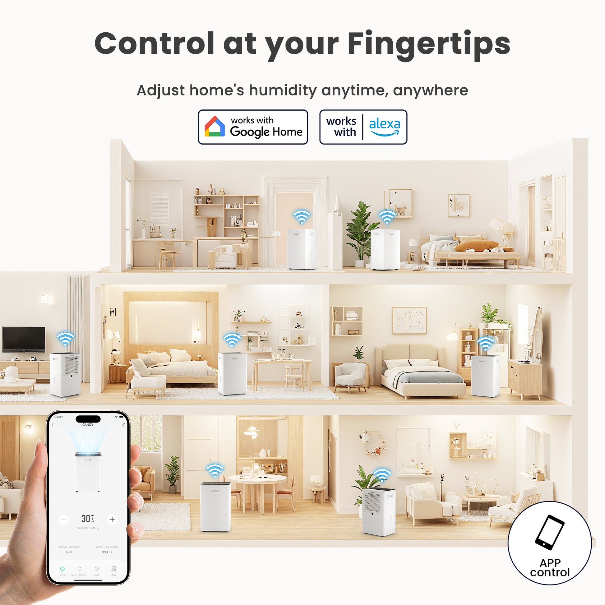 - Smart & Effortless Humidity Control – Seamlessly manage your Candy Dehumidifier with drain hose from anywhere via the Candy Home App (iOS/Android), Google Home, or Alexa. Simply set your target humidity (30%-90%), and let the smart system take over—our smart dehumidifier automatically pauses when humidity is optimal and restarts only when needed, saving energy while keeping your space perfectly dry. No more manual adjustments