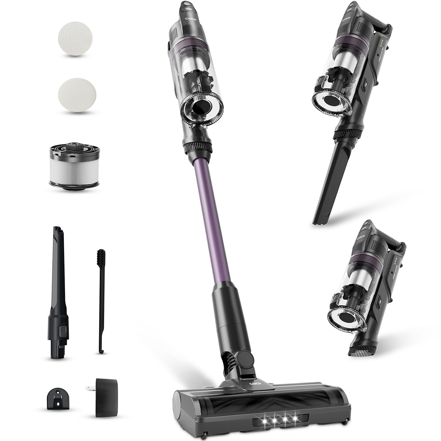 - Versatile Application Everywhere: Candy vacuum can converts from stick vacuum to handheld vacuum cordless in seconds. Brush head lies flat at 180°. Rotates 270°for maneuverability. This vacuum cordless can reaches under furniture,sofa and tight spaces.And our stick vacuum cordless includes multiple cleaning attachments,such as crevice tool,dust bin cleaning tool and wall mount.