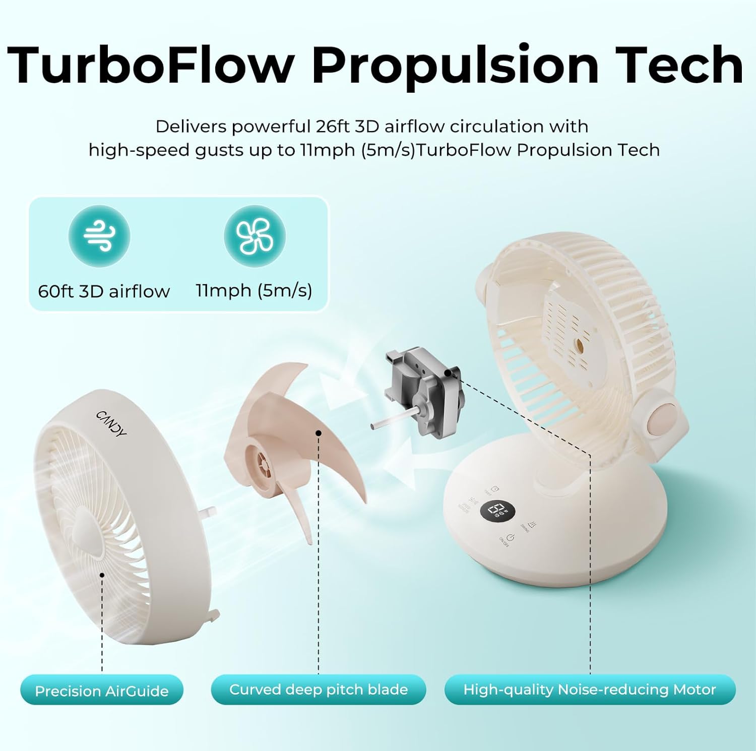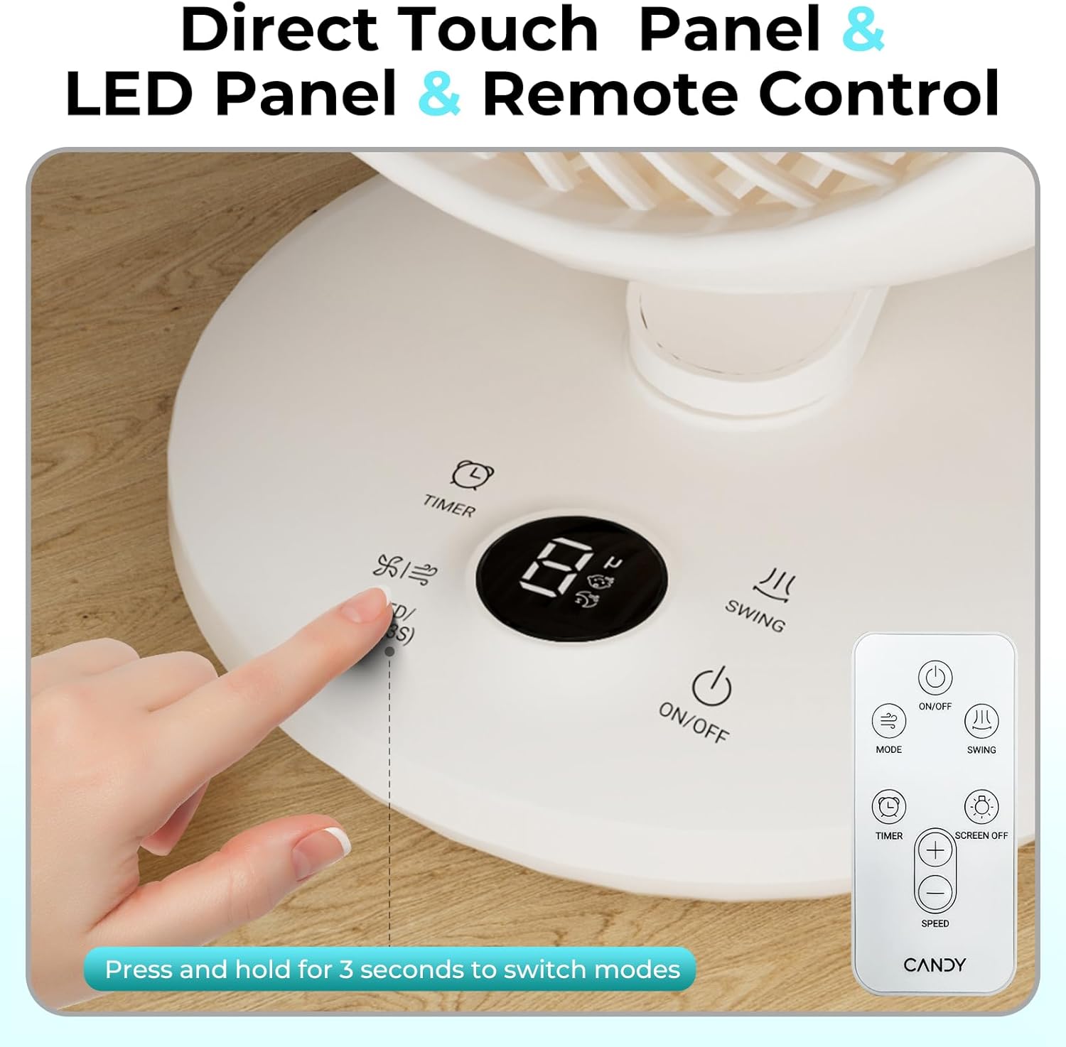 - Control at Your Fingertips, Clarity at a Glance:Command your environment with ease.The intuitive touch panel and clear LED display allow quick adjustments.Use the included remote to control this table fan from across the room—turn it on from bed, adjust modes from your desk, or switch it off from the couch.Full control of your Candy fan, delivered your way.