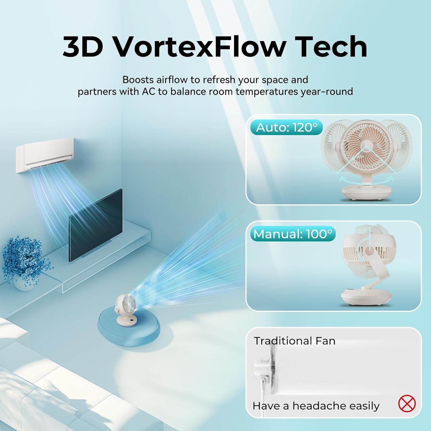 - Powerful, Yet Whisper-Quiet Cooling for Undisturbed Peace:Engineered with an advanced spiral propulsion system, our bedroom fan accelerates airflow to cool every corner in near silence—a hallmark of true desk fans small quiet.Paired with wide 120° horizontal and 100° vertical oscillation, this room fan ensures a stable, gentle breeze all night long, making it the perfect quiet bedside fan for uninterrupted sleep.